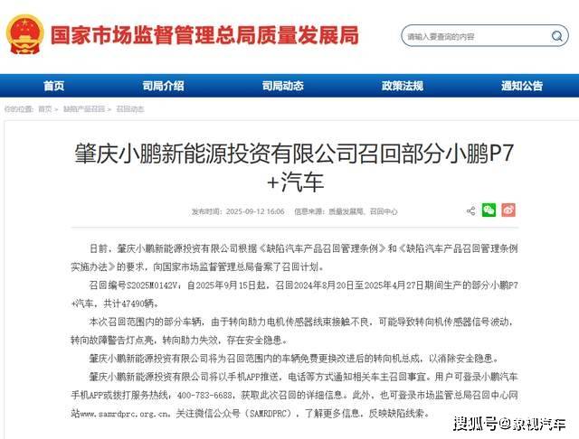 小鹏宣布自2025年9月15日起,召回2024年8月20日至2025年4月27日期间生产的部分小鹏p7 汽车,共计47490辆。