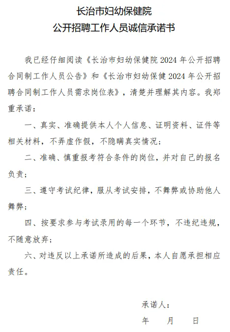 (2)《长治市妇幼保健院2024年公开招聘合同制工作人员报考诚信承诺书》纸质版(附件3)。