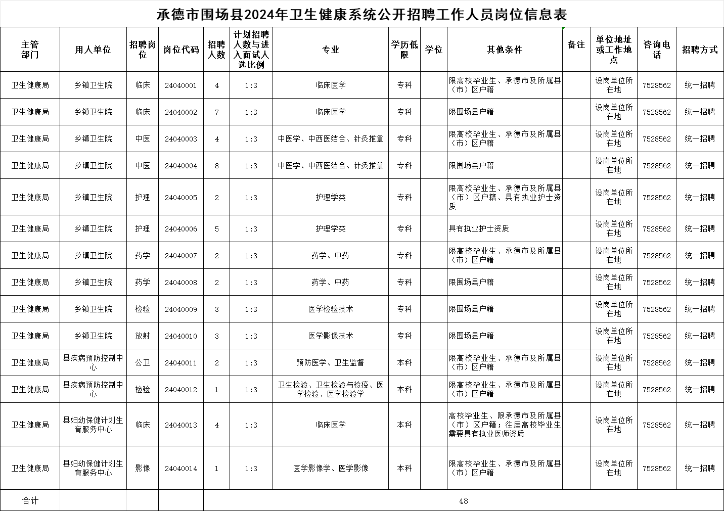 本次面向社会公开招聘卫生健康系统工作人员48人。具体招聘岗位、人数、条件等详情见附件《承德市围场县2024年卫生健康系统公开招聘工作人员岗位信息表》。